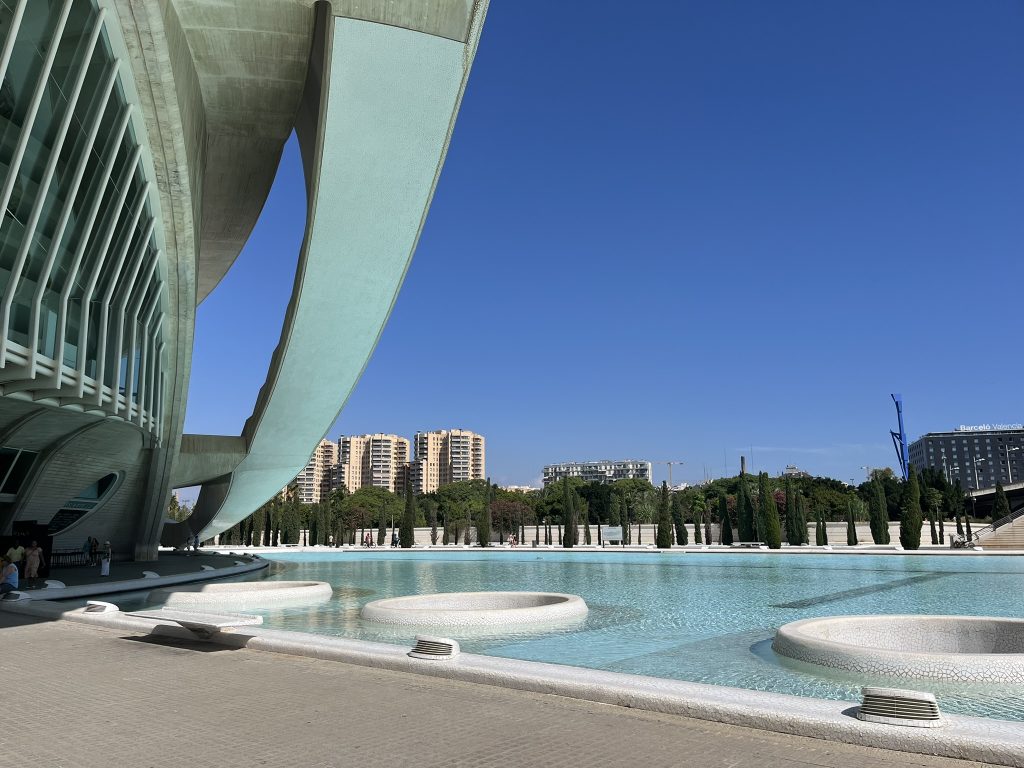 Our first stop on the red bus, was the iconic City of Arts and Sciences, set within Turia Park. If I could capture it in a single word, it would be stunning. Futuristic architecture surrounded by pools of clear, blue water, framed by long lines of trees. There are three main buildings dedicated to arts and science here, each one as striking as the last.